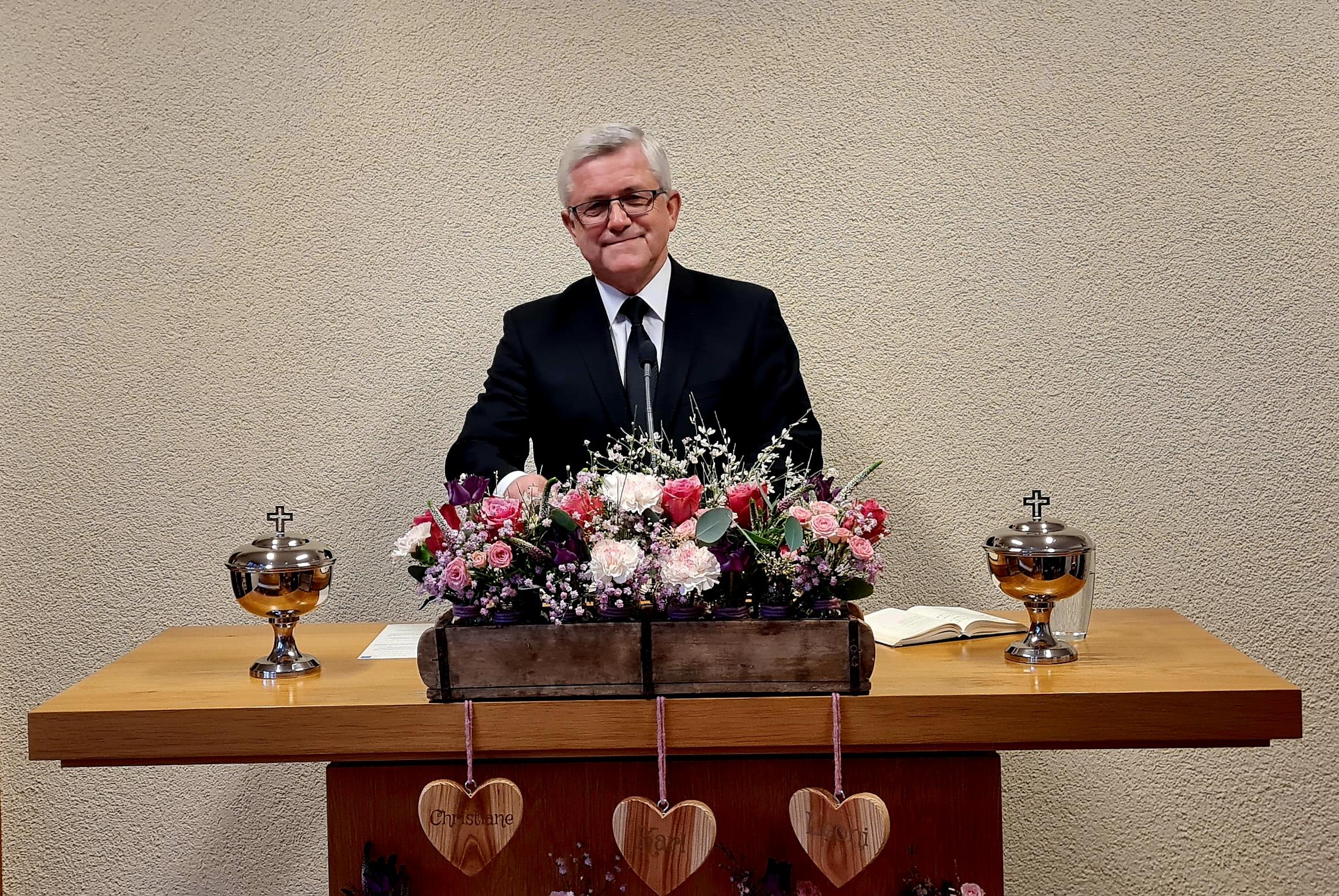 Bezirksältester Cramer vertiefte die Gedanken und griff dabei das Chorlied "Der Heiland sorgt für dich, täglich aufs neu..." ein Die Liebe zu Gott und Gottes Liebe zu uns schafft grenzenlosen Vertrauen, so der Bezirksälteste.