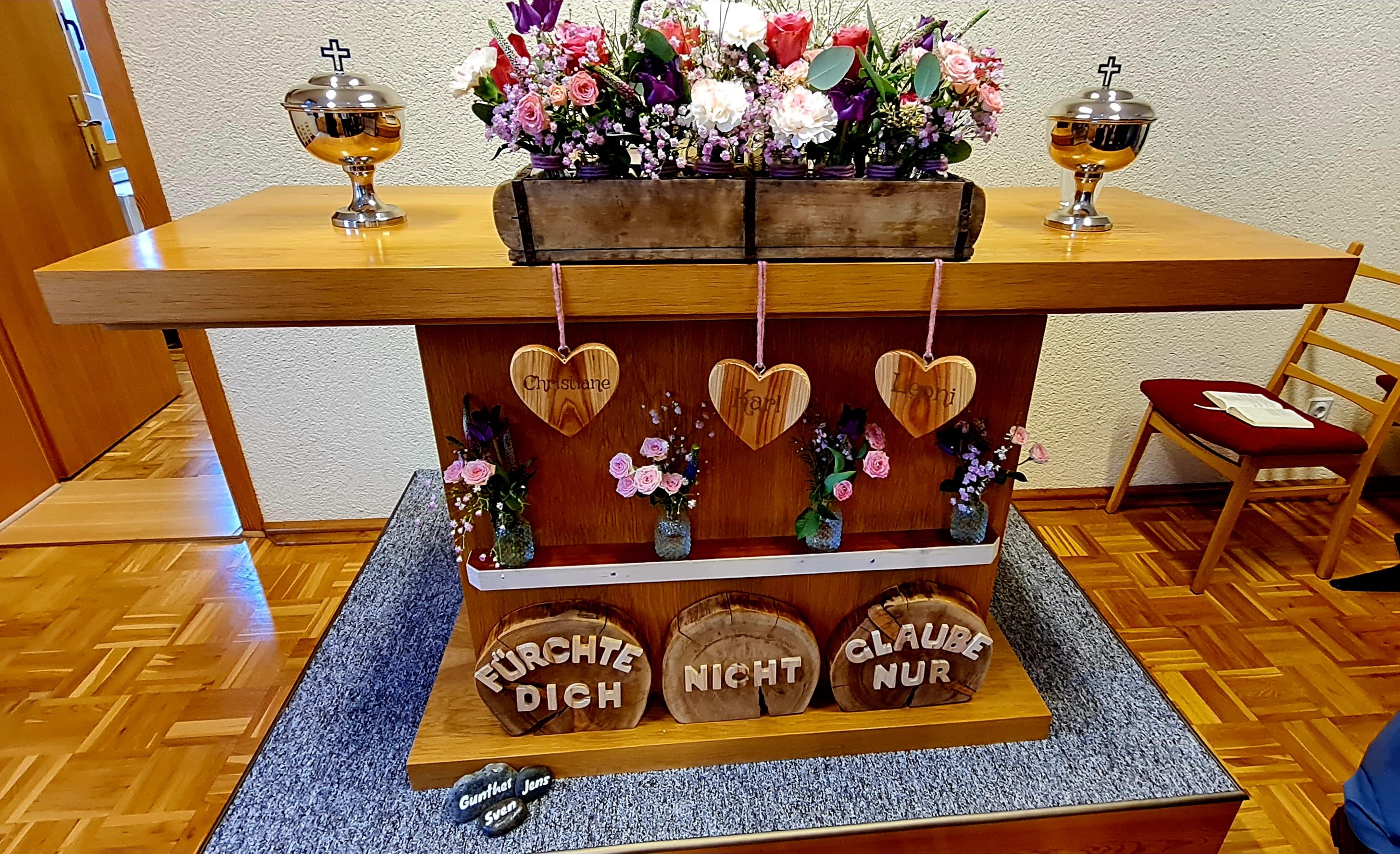 Ein festlicher Altar, mit den Namen der zu Versiegelnden auf Herzen geschrieben und die Namen der Amtsgaben auf Steine geschrieben, berührten schon vorher die Herzen.